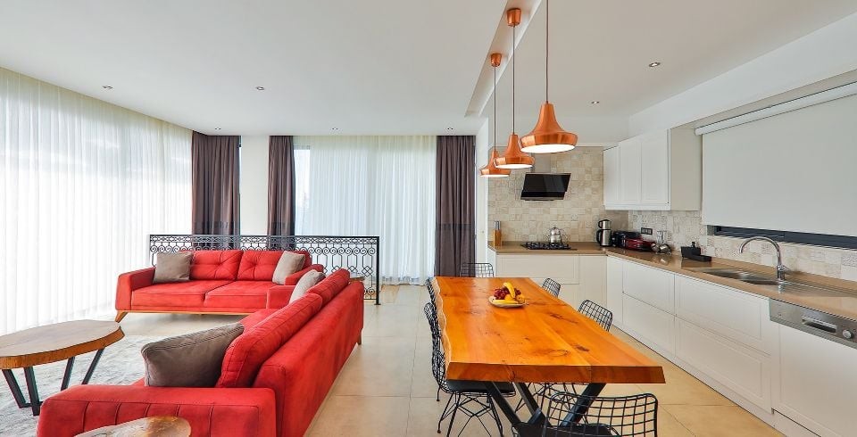 Mutfak : Amerikan mutfakta buzdolabı, çamaşır makinası, bulaşık makinası,4lü ocak, fırın, kettle, ekmek kızartma makinası, 4 kişilik yemek takımı, çatal bıçak takımı ve havuz başına çıkış bulunmaktadır.