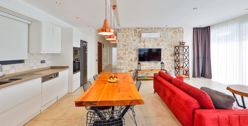 Salon : Villamız deniz manzaralı salonunda, oturma grubu, klima, ütü, ütü masası, TV, DVD, yemek masası, WİFİ havuz basına çıkış bulunmaktadır.