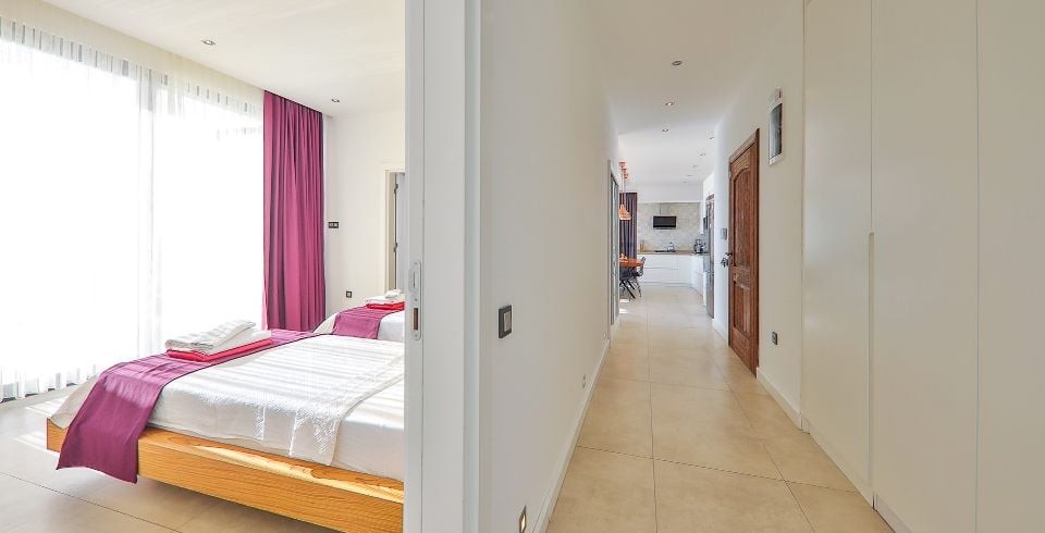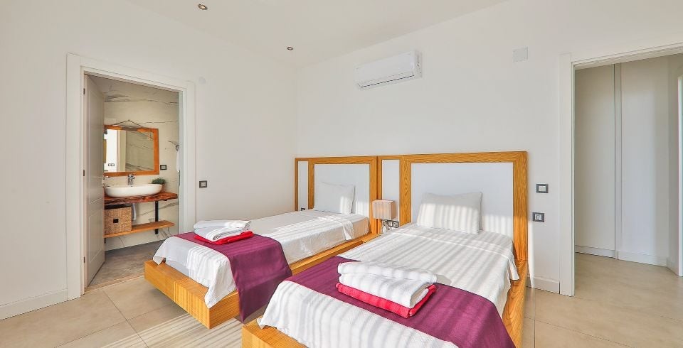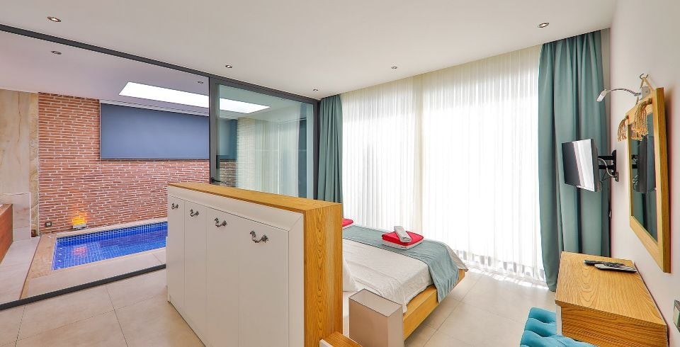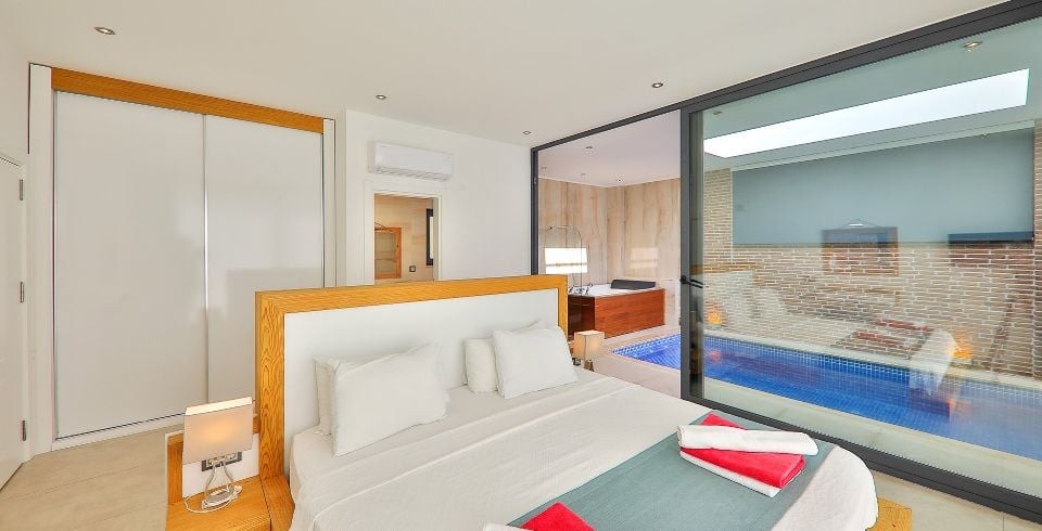 1. Yatak Odası : Çift kişilik süit yatak odası, klima, elbise dolabı, makyaj masası, komodin, lavabo ve banyo bulunmaktadır. Ayrıca ısıtma havuzu ve jakuzi yatak odası bölümünde yer almaktadır.