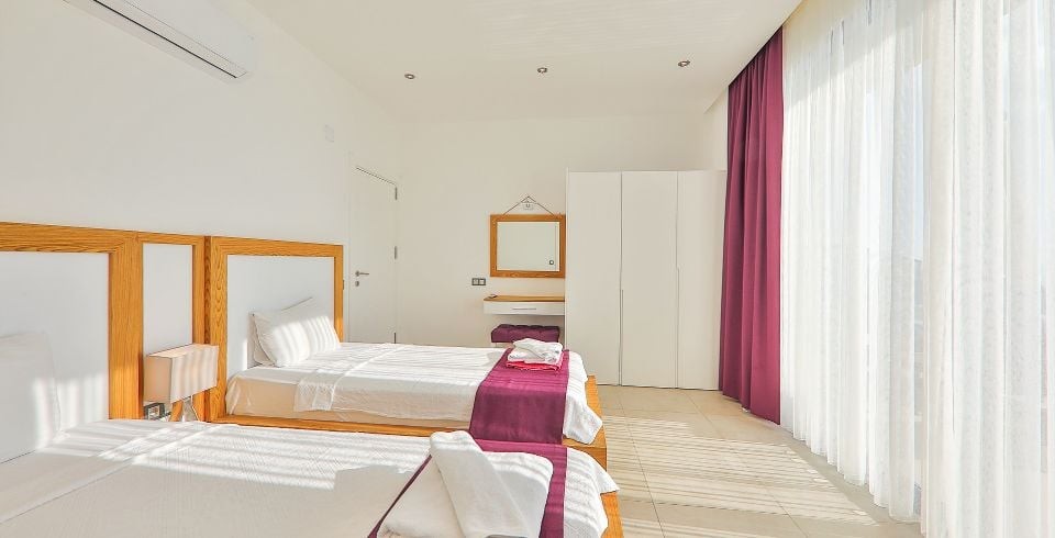 2. Yatak Odası : 2 adet tek kişilik yatak, komodin, makyaj masası, elbise dolabı, klima banyo ve lavabo bulunmaktadır.