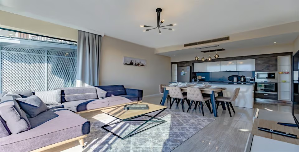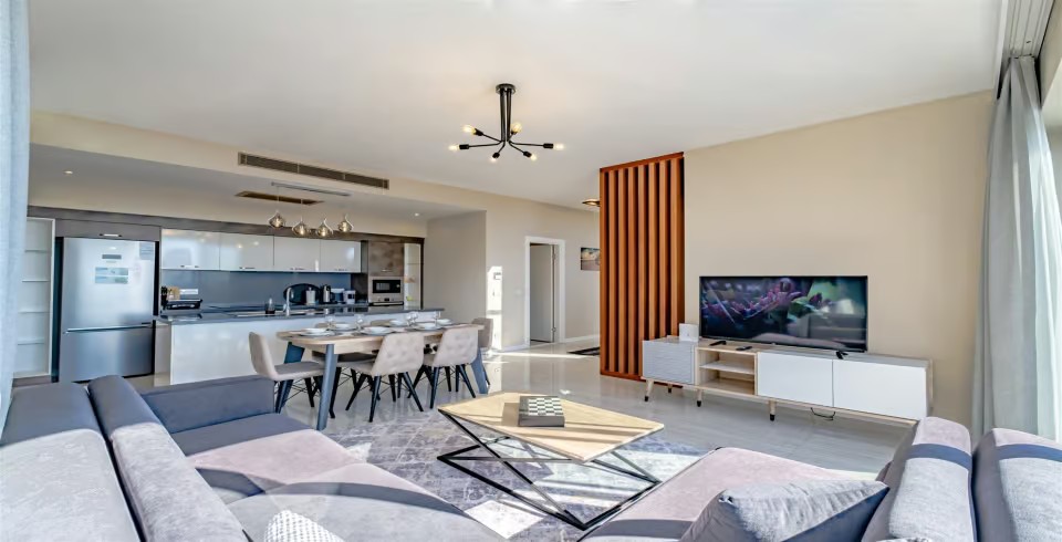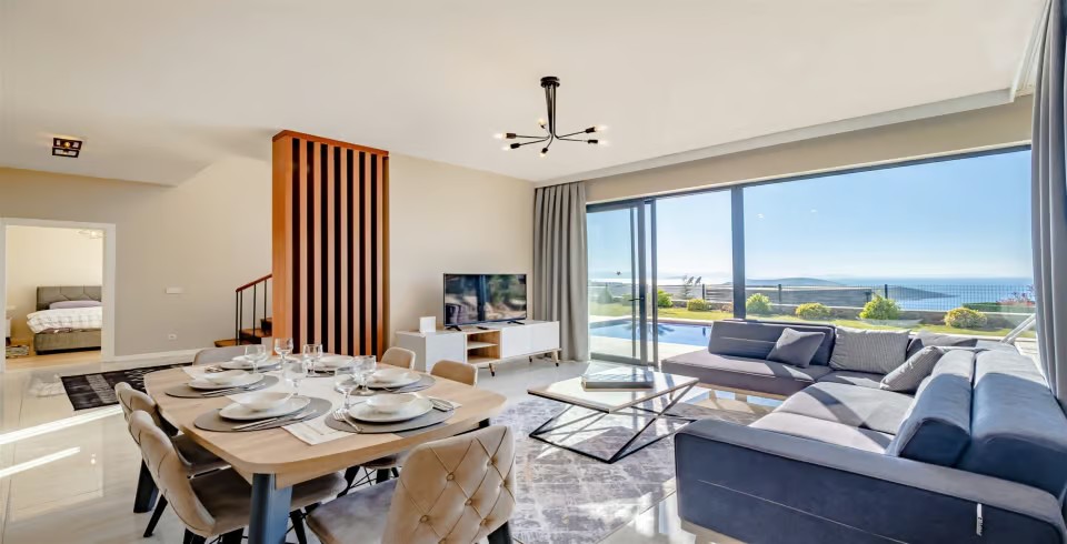 Salon : Salon içerisinde oturma grubu, TV, klima ve sehpa bulunmaktadır. Havuz terasına çıkış sağlanabilir.