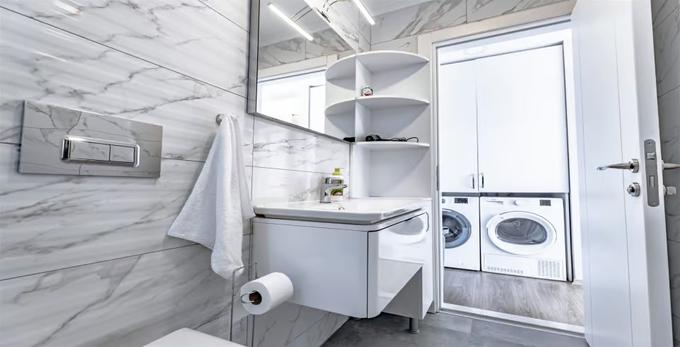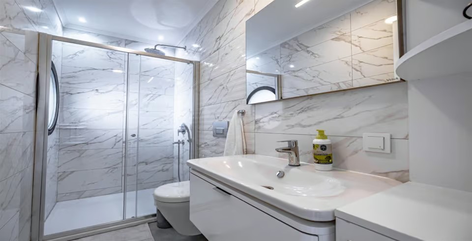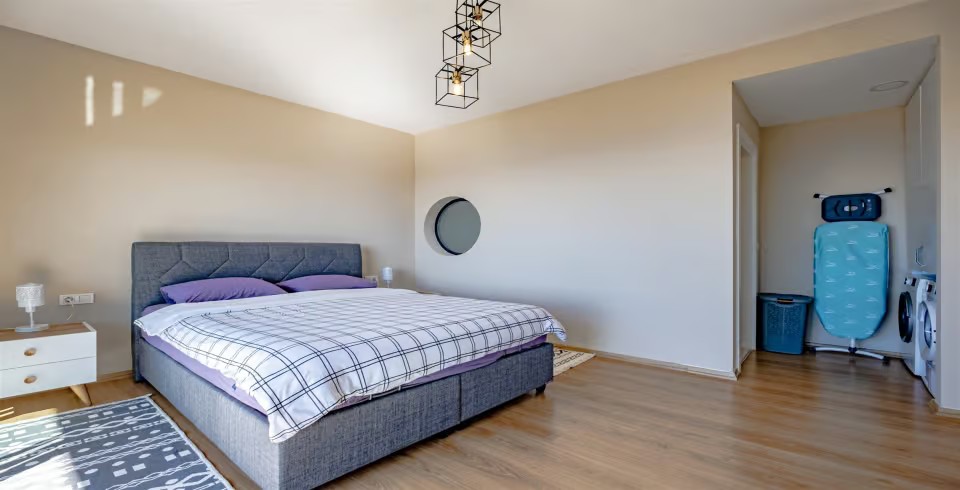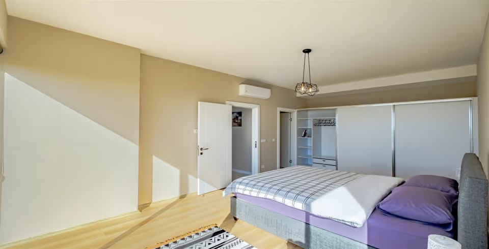 1. Yatak Odası: 1 adet çift kişilik yatak, odaya özel banyo, klima, çamaşır ve kurutma makinesi.