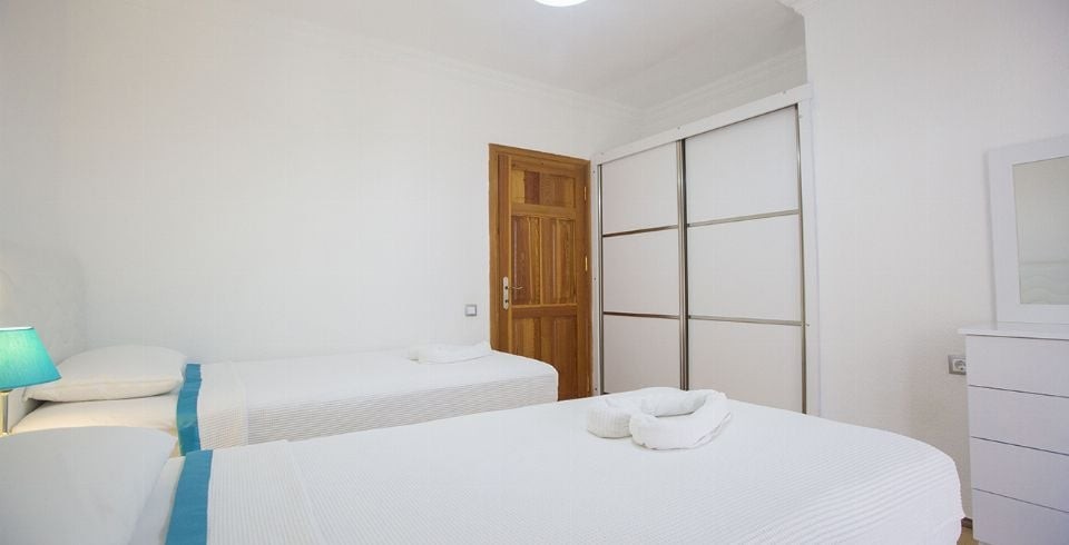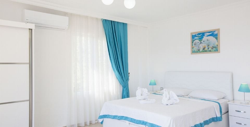 1. Yatak Odası : Çift kişilik yatak, elbise dolabı, komodin, klima, banyo ve tuvalet bulunmaktadır. Havuz terasına çıkış yapılabilmektedir.