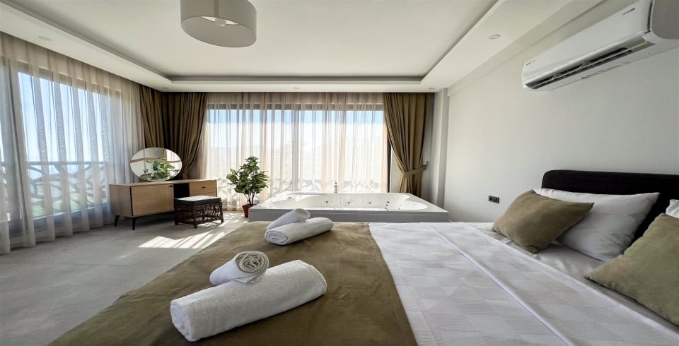 1.Yatak Odası:  Çift kişilik yatak, jakuzi, klima,elbise dolabı, makyaj masası,tuvalet ve banyo bulunmaktadır.