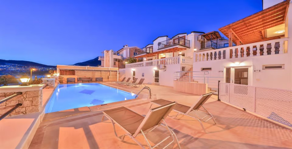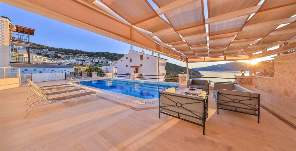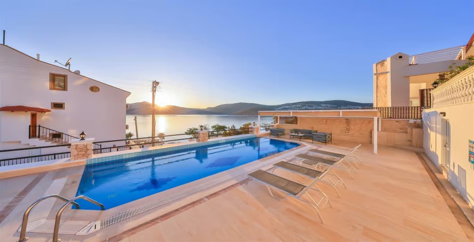 Havuz : Villamızın özel yüzme havuzu bulunmakta olup havuz başından deniz ve kalkan manzarası seyredilmektedir.