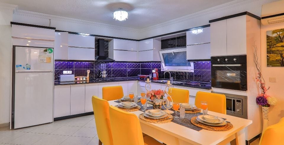 Mutfak : Villamızın geniş Amerikan mutfağı ile sizlere kendi evinizin mutfağı gibi hissettirecek. Ayrıca mutfakta klima, bulaşık makinası, buzdolabı, çamaşır makinası, mikrodalga fırın, tost makinası, ekmek kızartma, su ısıtıcısı, fırın, 4`lü ocak seti ve 6 kişilik geniş yemek masası ile tava tencere vb. mutfak araç gereçlerini kullanma fırsatını sizlere sunuyoruz.