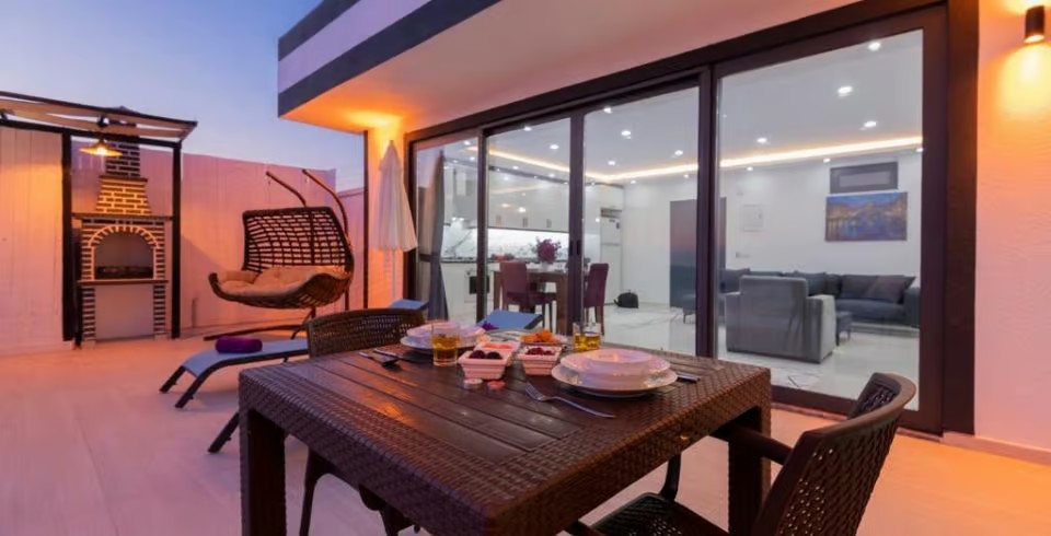 Bahçe : Villamızın bahçesinde özel yüzme havuzu, güneşlenmeniz için 2 adet şezlong, güneşlenme terası, 4 kişilik masa, oturma grubu, mangal keyfiniz için barbekü, güneş şemsiyesi bulunmaktadır.