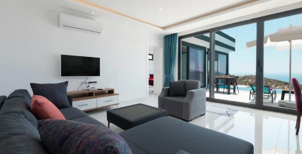 Salon : Villa Meris in salonunda sizi şık bir oturma grubu ile klima, televizyon, internet, uydu, koltuk, sehpa ile ferah bir salon bekliyor olacaktır. Havuz terasına çıkış yapılmaktadır.