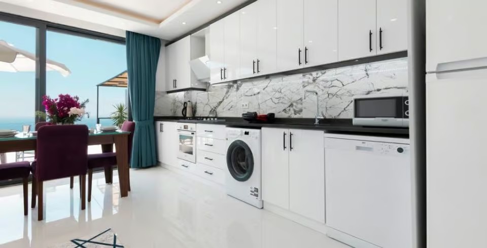 Mutfak : Villamızın geniş Amerikan mutfağı ile sizlere kendi evinizin mutfağı gibi hissettirecek. Ayrıca mutfakta klima, bulaşık makinası, buzdolabı, çamaşır makinası, mikrodalga fırın, tost makinası, ekmek kızartma, su ısıtıcısı, fırın, 4`lü ocak seti ve 4 kişilik geniş yemek masası ile tava tencere vb. mutfak araç gereçlerini kullanma fırsatını sizlere sunuyoruz.