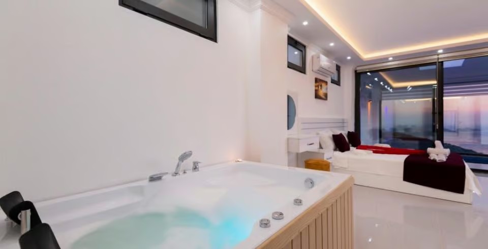 Yatak Odası : 1 adet çift kişilik yatak, ısıtmalı havuzu klima, jakuzi, komodin, elbise dolabı, makyaj masası, banyo ve lavabo bulunmaktadır. Bebek yatağı ve mama sandalyesi mevcuttur.