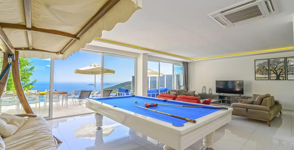Salon : Villa salonunda konforlu oturma grubu, klima, TV, internet, uydu alıcı, yemek masası, sehpa bulunmaktadır.