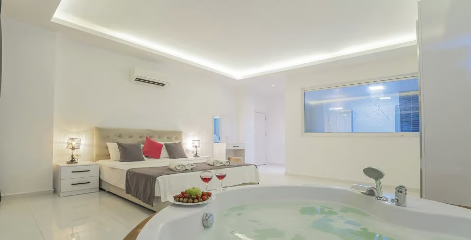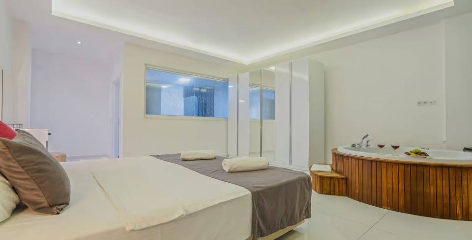 1. Yatak Odası : Çift kişilik yatak, klima, jakuzi, komodin, elbise dolabı, banyo ve tuvalet ortak kullanımdır.