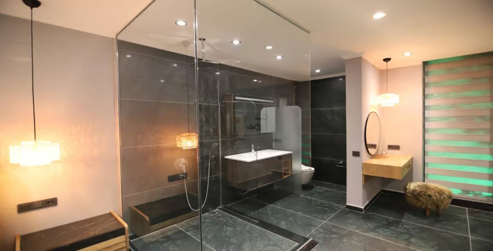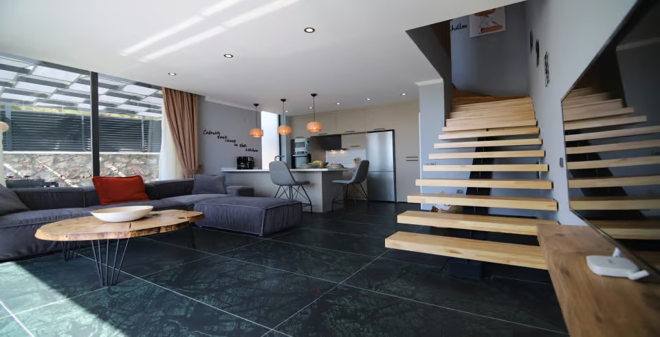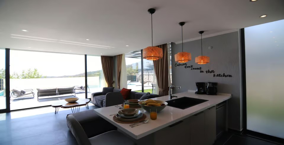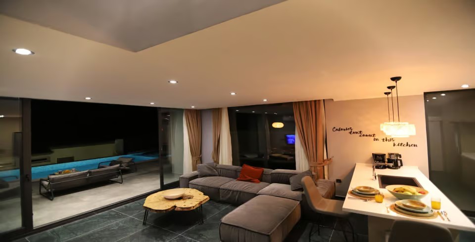Salon : Salon içerisinde oturma grubu, TV, klima, sehpa bulunmaktadır. Havuz terasına çıkış yapılabilmektedir.
