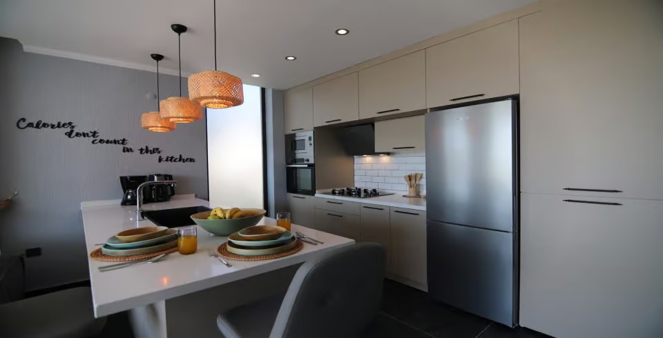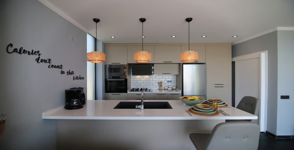 Mutfak : Modern Amerikan mutfak içerisinde 2 kişilik yemek masası, buzdolabı, bulaşık makinası, fırın, ocak, tost makinası, yemek masası, yemek takımları, çatal ve bıçak takımları, tencere ve tava takımları, bardaklar bulunmaktadır.