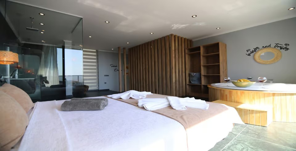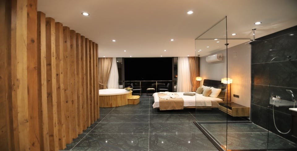 Yatak Odası : 1 adet çift kişilik yatak, klima, komodin, elbise dolabı, jakuzi, banyo ve tuvalet bulunmaktadır.