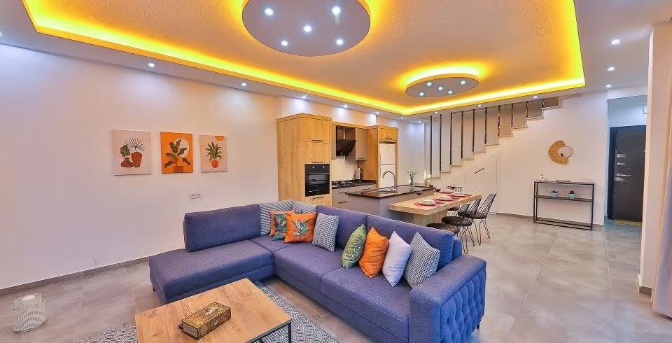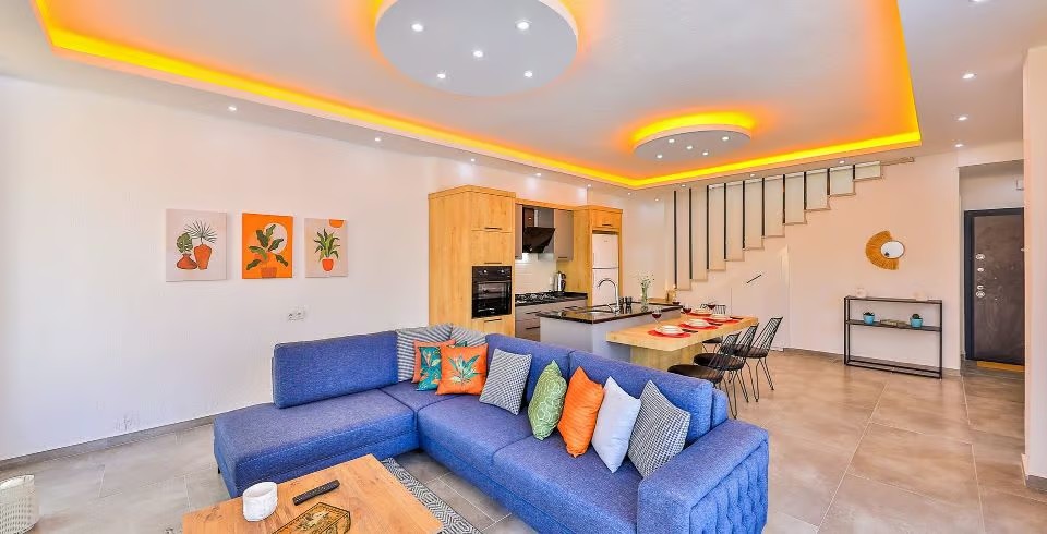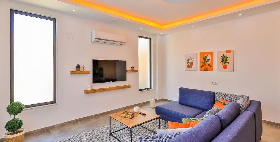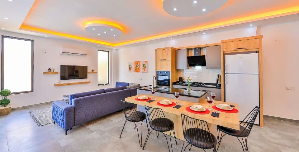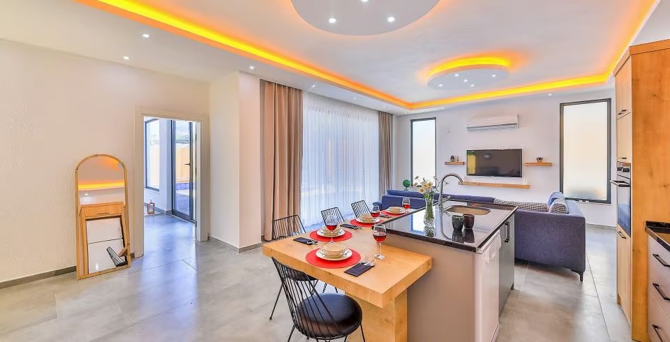 Salon : Salon içerisinde oturma grubu, tTV, klima,  sehpa bulunmaktadır. Havuz terasına çıkış yapılabilmektedir.