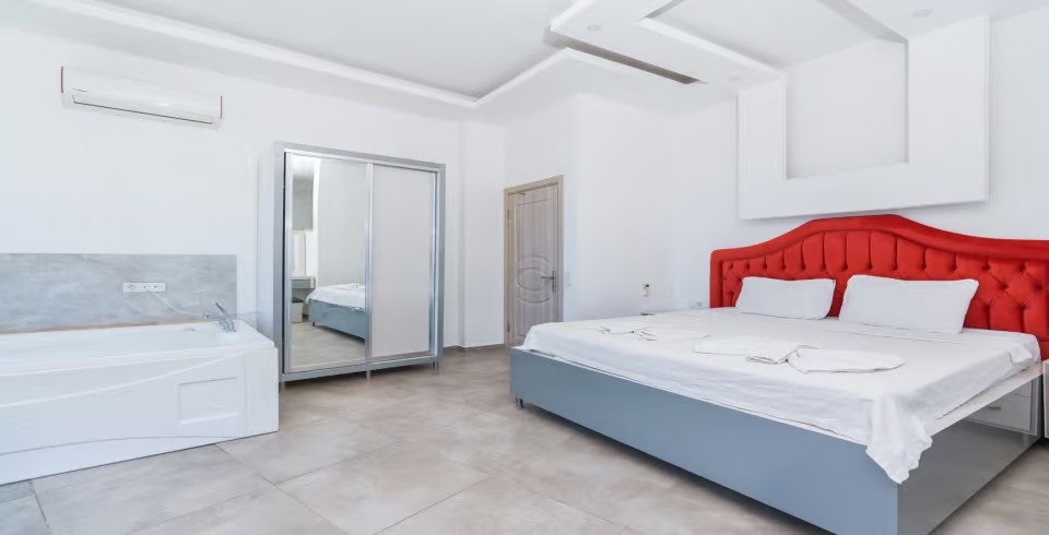 1. Yatak Odası : 1 adet çift kişilik yatak, klima, komodin, elbise dolabı, makyaj masası,  jakuzi, banyo ve tuvalet bulunmaktadır.