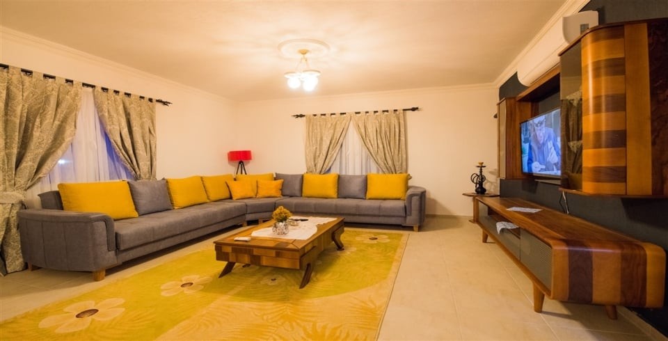 Salon : Villa Mevsim'in salonunda sizi şık bir oturma grubu, klima, TV, koltuk, sehpa ile ferah bir salon bekliyor olacaktır.