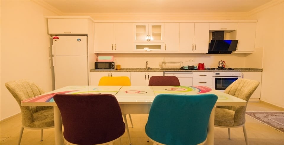Mutfak : Villamızın geniş Amerikan mutfağı ile sizlere kendi evinizin mutfağı gibi hissettirecek. Ayrıca mutfakta klima, bulaşık makinası, buzdolabı, çamaşır makinası, mikrodalga fırın, tost makinası, ekmek kızartma, su ısıtıcısı, fırın, ocak seti ve 6 kişilik geniş yemek masası ile tava tencere vb. mutfak araç gereçlerini kullanma fırsatını sizlere sunuyoruz.