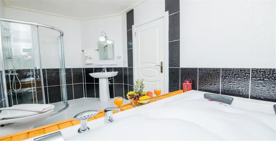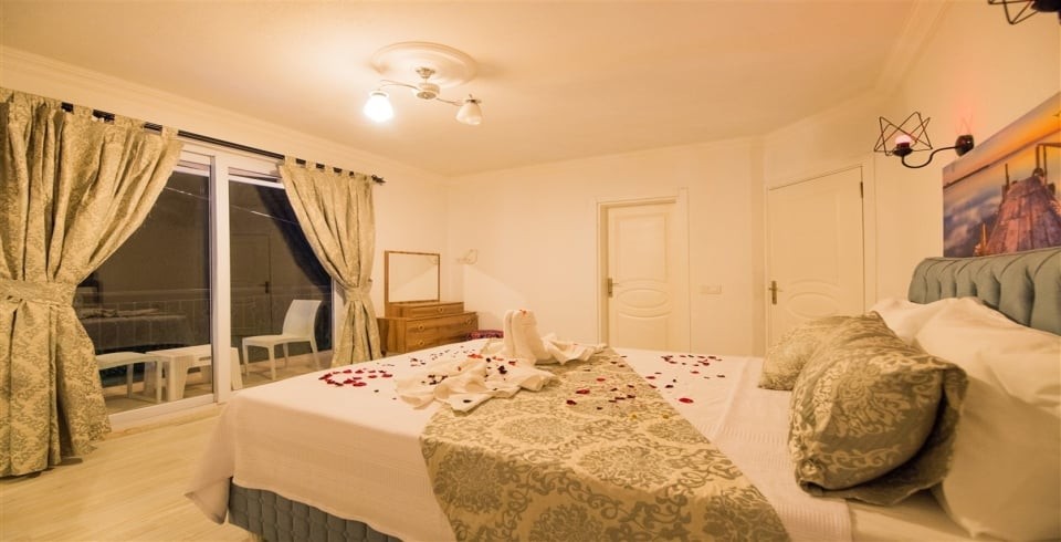 1. Yatak Odası : İki kişilik yatak,Jakuzi,Klima,Komodin,Makyaj masası,tuvalet ve banyo bulunmaktadır.