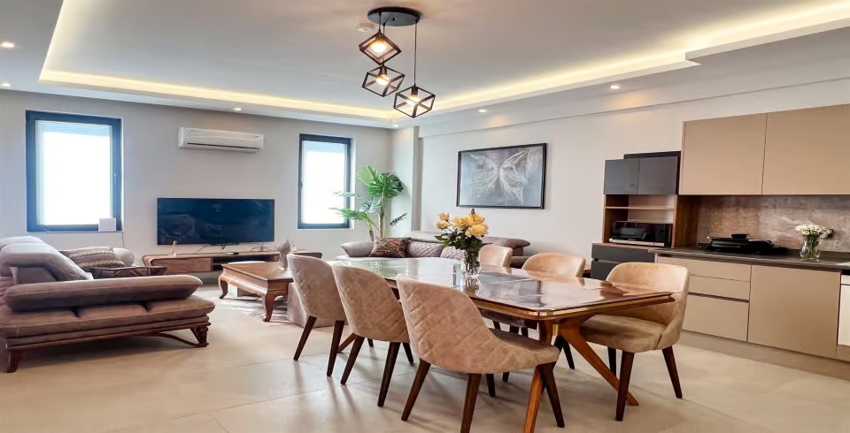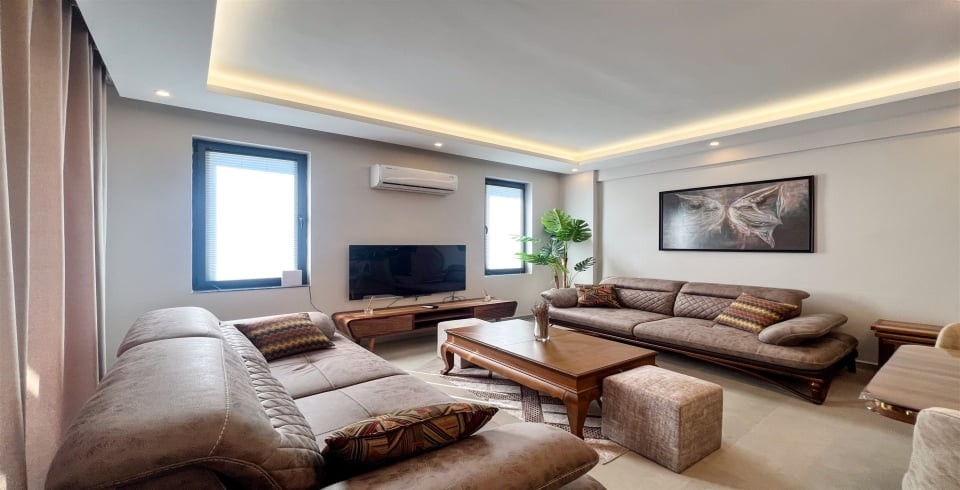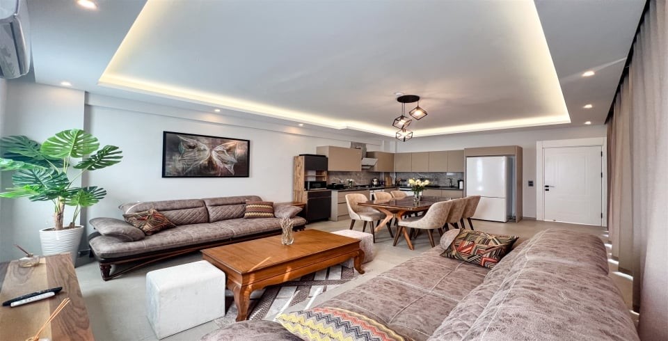 Salon: Özenle döşenmiş salon, modern koltuklar, yemek masası, LCD TV ve klima bulunmaktadır.