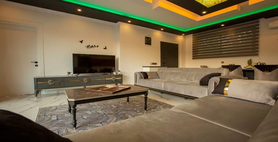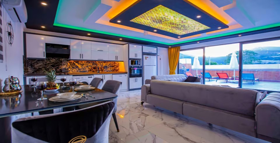 Salon: Villa salonunda konforlu oturma grubu, klima, TV, internet, uydu alıcı, yemek masası, sehpa bulunmaktadır.