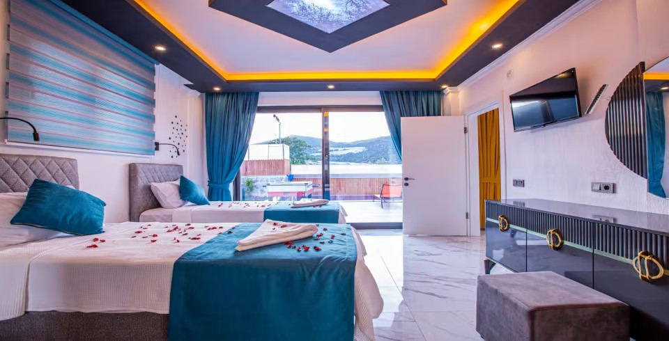 1. Yatak Odası: Çift kişilik yatak, klima, jakuzi, TV, komodin, elbise dolabı, makyaj masası, banyo ve tuvalet bulunmaktadır.