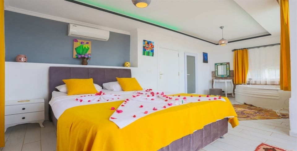 1. Yatak Odası : Birinci yatak odamızda 1 adet çift kişilik yatak, klima, elbise dolabı, makyaj masası, banyo ve lavabo bulunmaktadır. Doğa ile iç içe olup aynı zamanda da muhafazakar villamızda tatilin keyfini doyasıya çıkaracağınız jakuzi de bulunmaktadır.