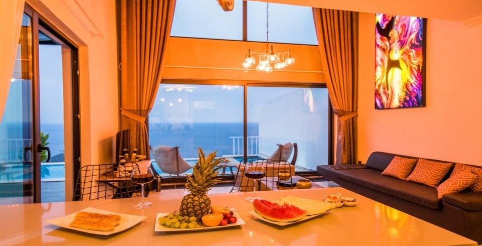 Salon : Deniz manzaralı salonumuzda; Oturma grubu, uydu tv (LCD), klima, 6 kişilik yemek masası, wc & lavabo ve havuz terasına çıkış bulunmaktadır.
