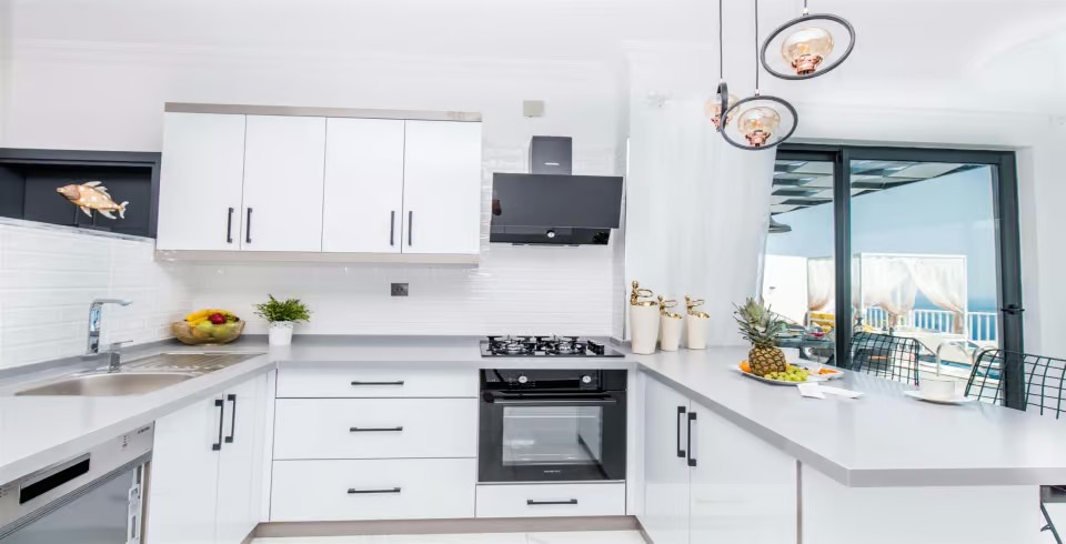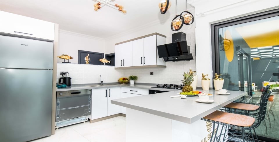 Mutfak :Modern Amerikan mutfağımızda; Buzdolabı, bulaşık makinesi, çamaşır makinesi, filtre kahve makinesi ve fırının yanı sıra bütün mutfak ekipmanları mevcuttur.