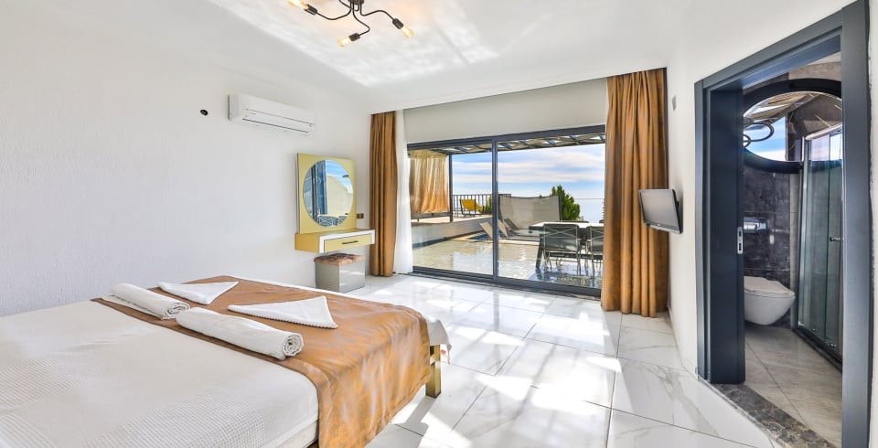 3.Yatak Odası : Aile Yatak Odasında; 1 adet çift kişilik yatak, Makyaj masası, Komodin, Klima, Elbise dolabı, Banyo ve Havuz Terasına çıkış bulunmaktadır.