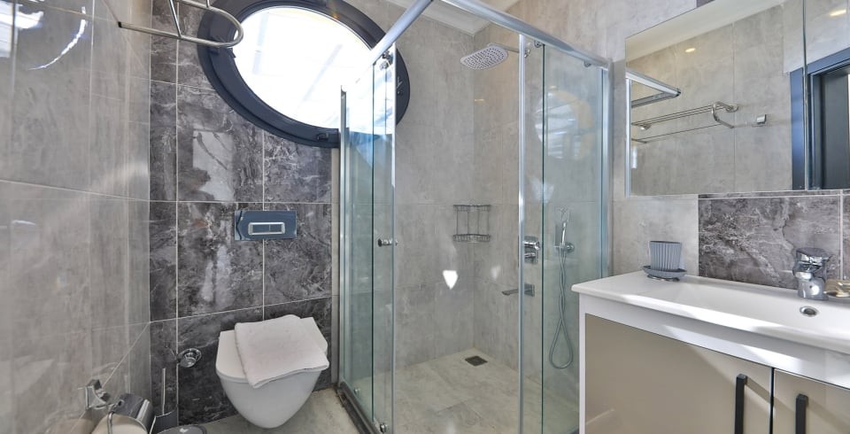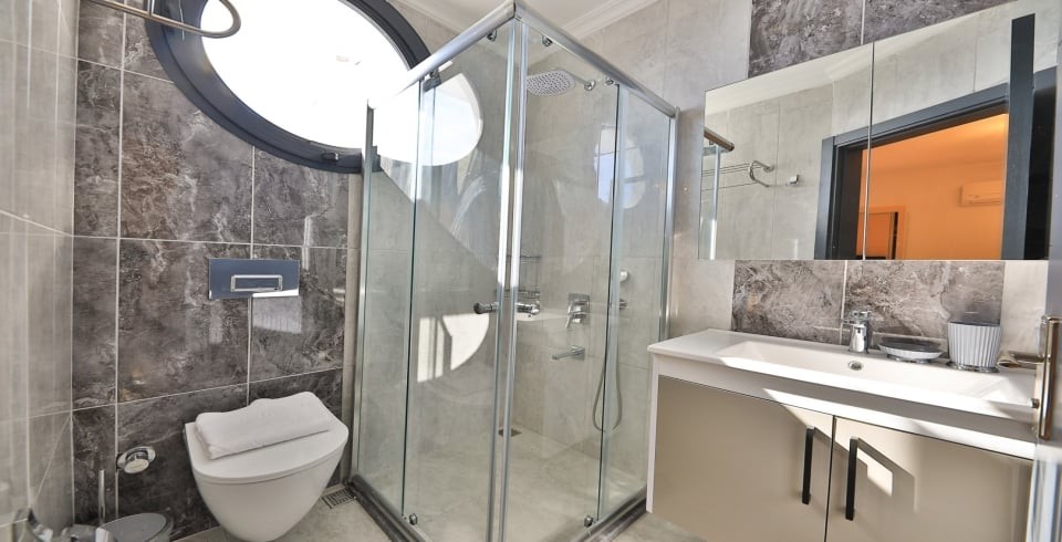 Salon : Deniz manzaralı salona sahip salonumuz; Oturma grubu, Uydu TV (LCD), Klima, 6 kişilik yemek masası, WC & Lavabo ve Havuz terasına çıkış bulunmaktadır.