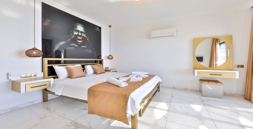 1.Yatak Odası : Süit Aile Yatak Odasında; Çift kişilik yatak, Makyaj masası, Komodin, Klima, Elbise dolabı, Banyo ve Jakuzi bulunmaktadır.