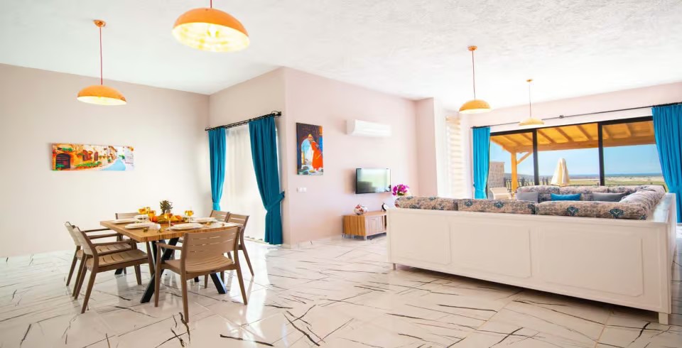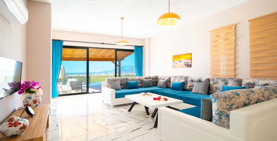 Salon : Villa salonunda oturma grubu, TV, internet, klima, sehpa bulunmaktadır.
