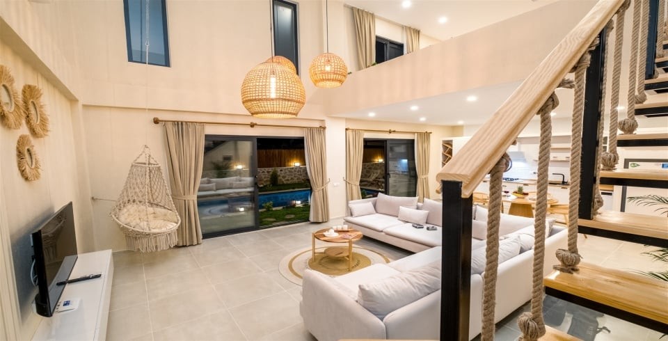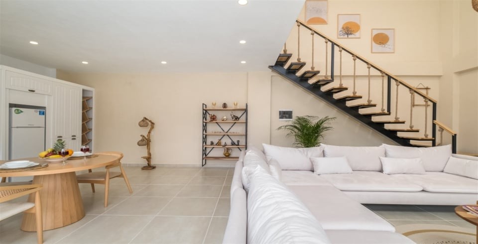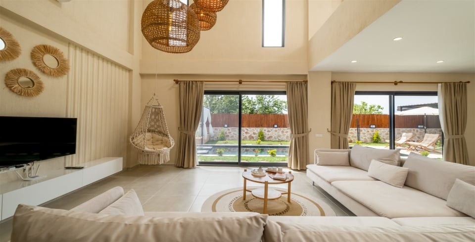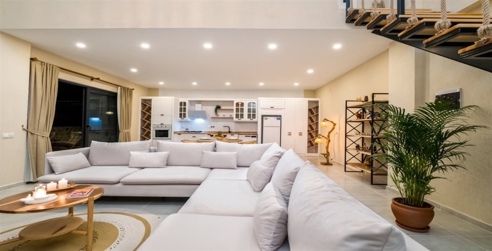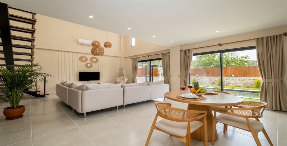 Salon : Kiralık Villamızın salonunda konforlu oturma grubu, klima, TV, internet, uydu alıcı, yemek masası, sehpa bulunmaktadır.