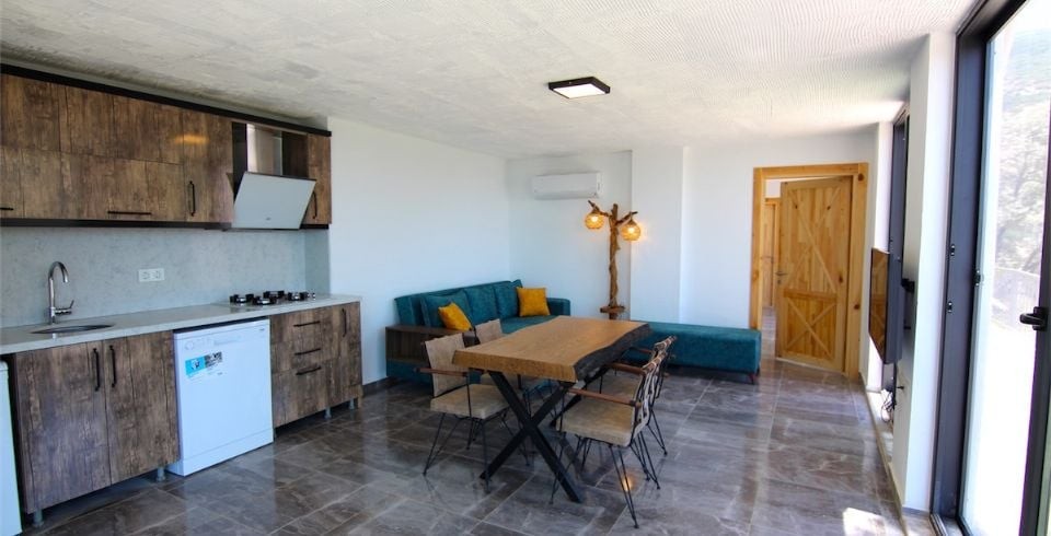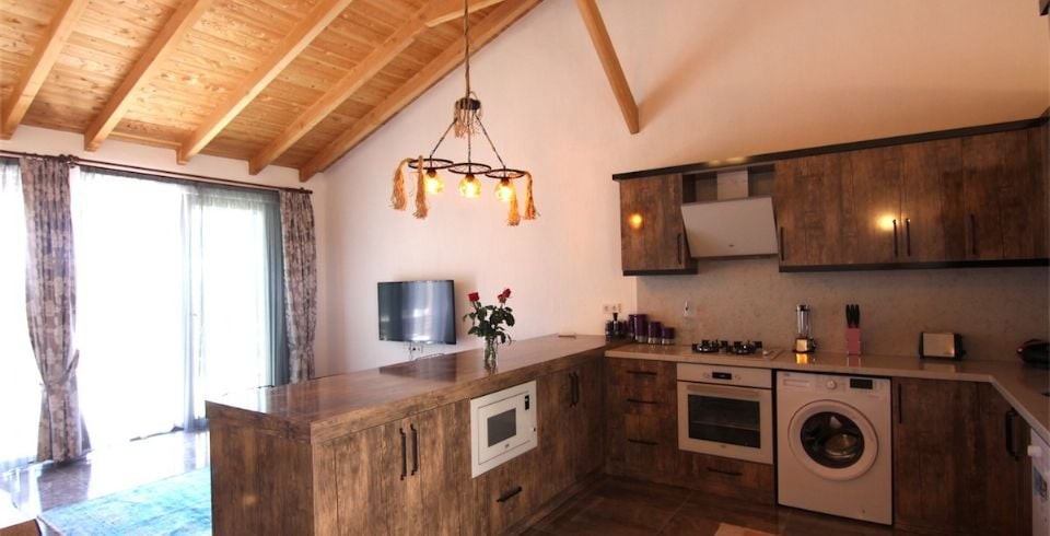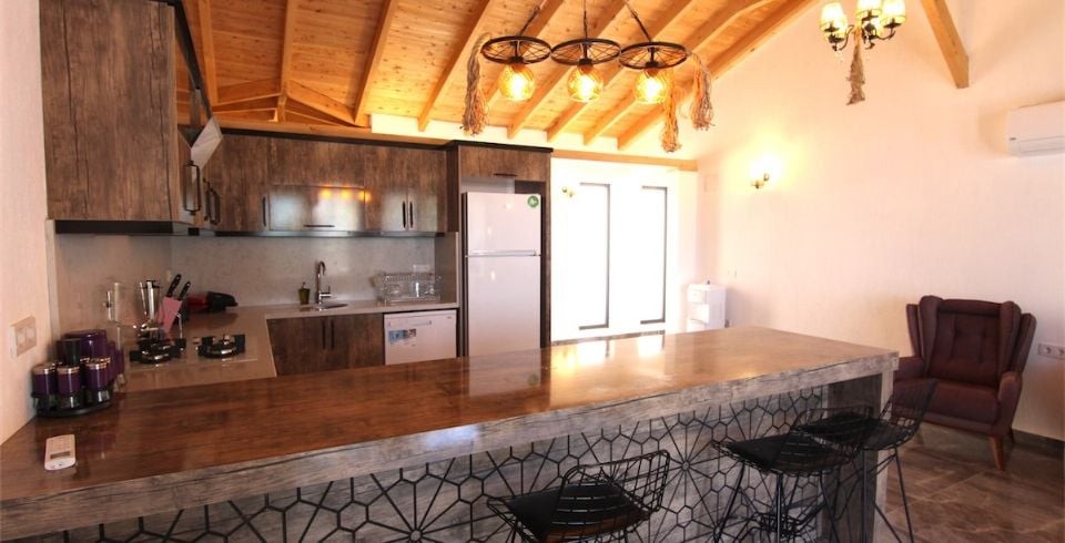 Mutfak : Villamızın geniş Amerikan mutfağı ile sizlere kendi evinizin mutfağı gibi hissettirecek. Ayrıca mutfakta klima, bulaşık makinası, buzdolabı, çamaşır makinası, mikrodalga fırın, tost makinası, ekmek kızartma, su ısıtıcısı, fırın, 4'lü ocak seti ile tava tencere vb. mutfak araç gereçlerini kullanma fırsatını sizlere sunuyoruz.