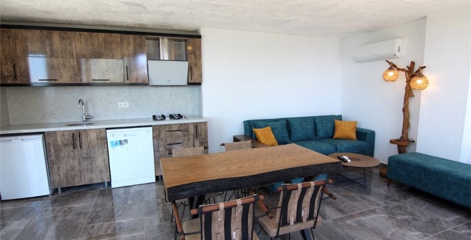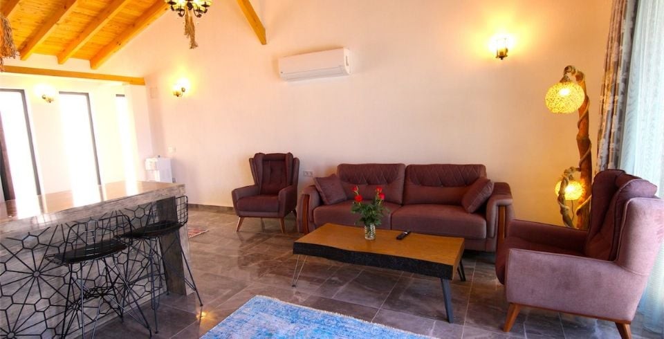 Salon : Villa Myra’nın salonunda sizi şık bir oturma grubu ile klima, televizyon, internet, uydu, koltuk, sehpa ile ferah bir salon bekliyor olacaktır. Havuz terasına çıkış yapılmaktadır.