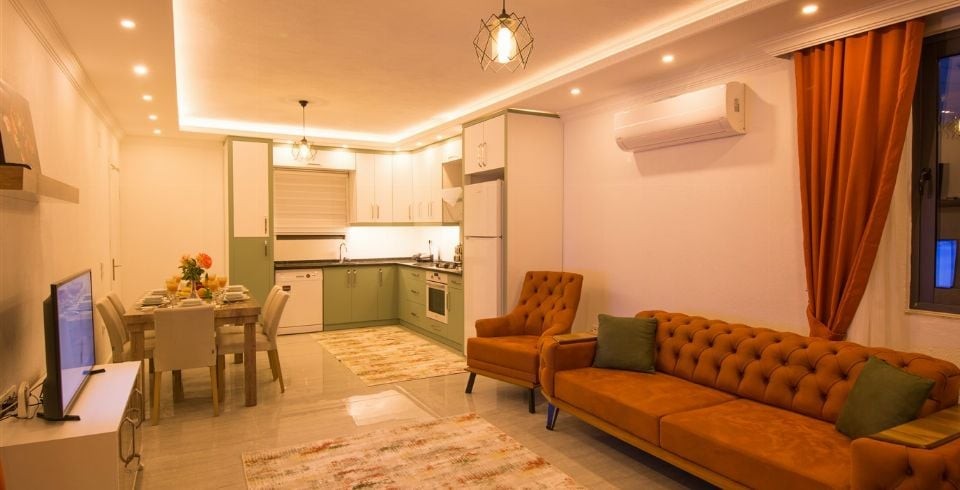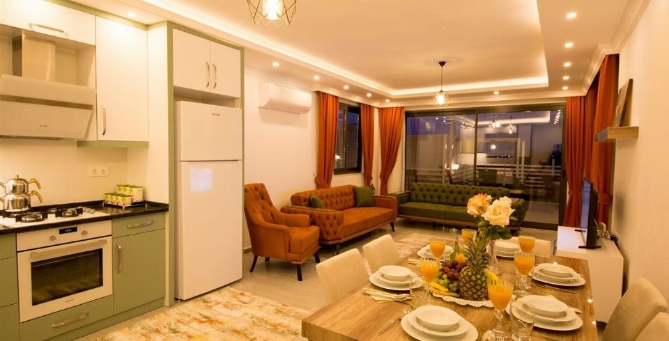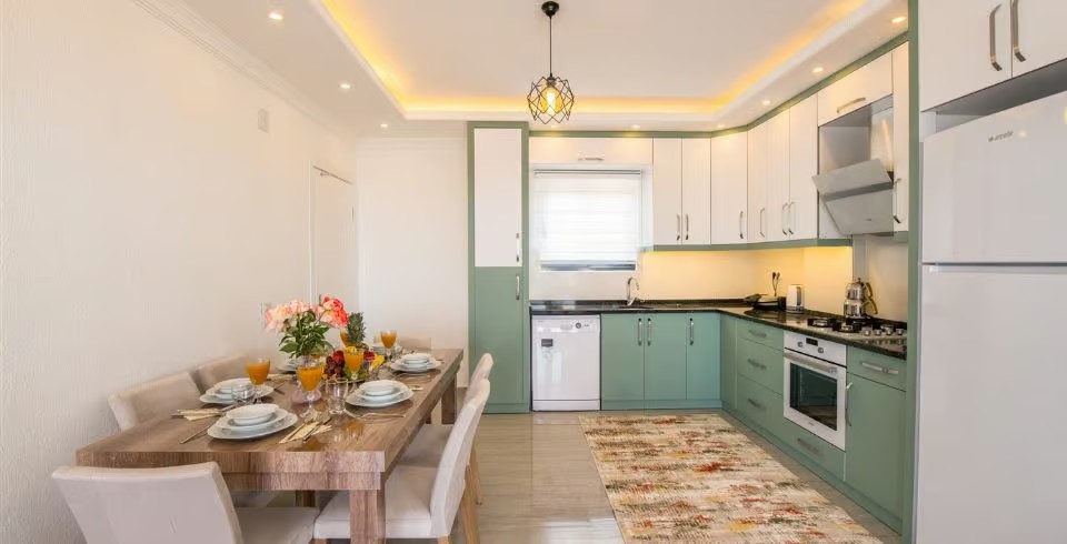 Mutfak : Amerikan açık mutfak, bulaşık makinası, buzdolabı, çamaşır makinası, ekmek kızartma, su ısıtıcısı, fırın, 4'lü ocak seti, yemek masası ve mutfak araç gerekleri 4 kişilik olarak mevcuttur.