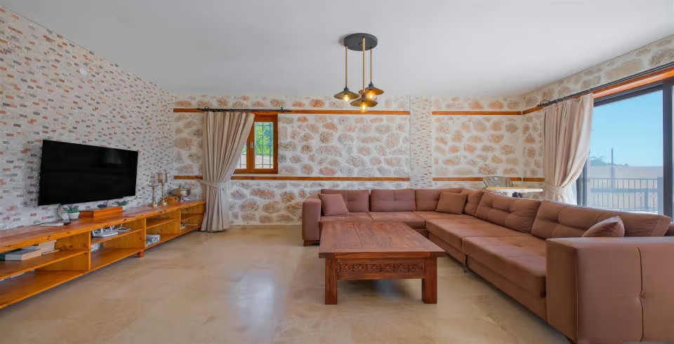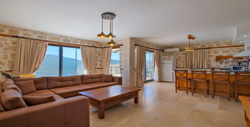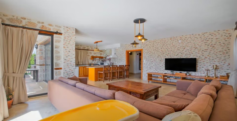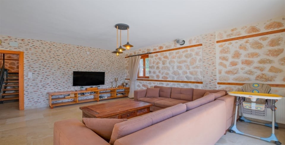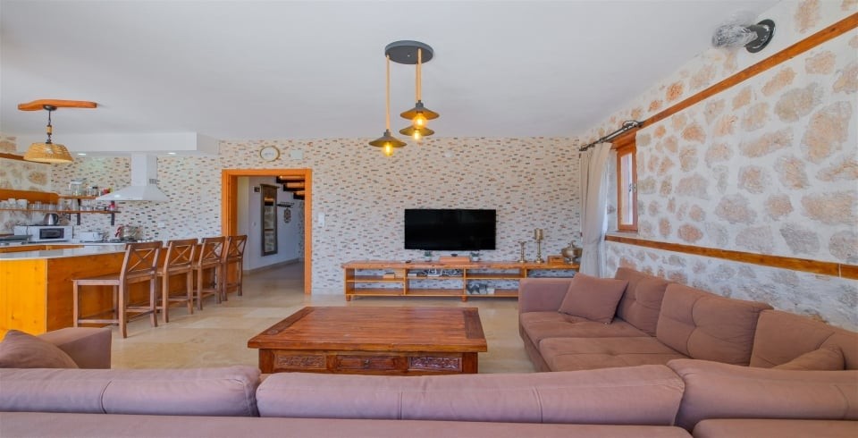 Salon : Kiralık yazlık villamızın salonunda klima, oturma grubu, sehpa, TV, DVD, uydu, internet, sehpa, banyo & WC bulunmaktadır.