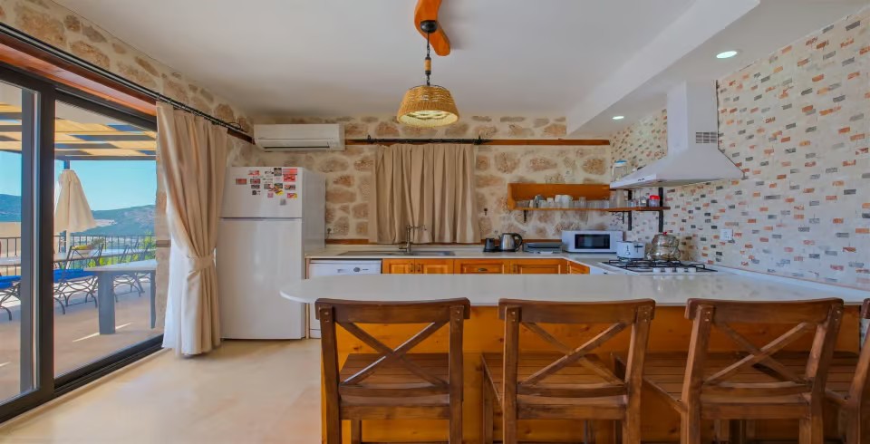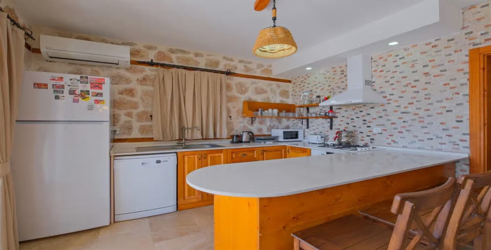 Mutfak : Açık Amerikan mutfak, buzdolabı, çamaşır makinası, bulaşık makinası, fırın, kettle, ekmek kızartma makinası, mikrodalga fırın, 4'lü ankastre ocak, yemek masası ve sandalyesi  ve mutfak araç gereçleri villamızda  bulunmaktadır.