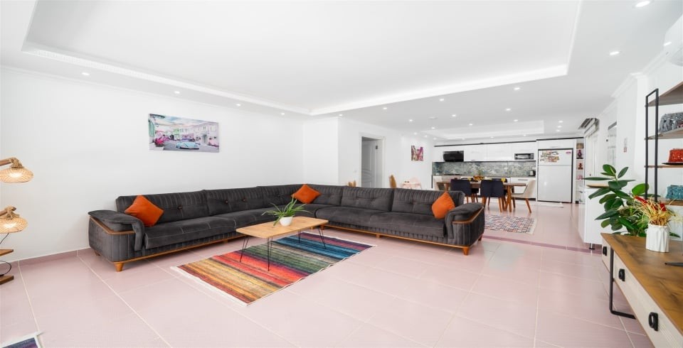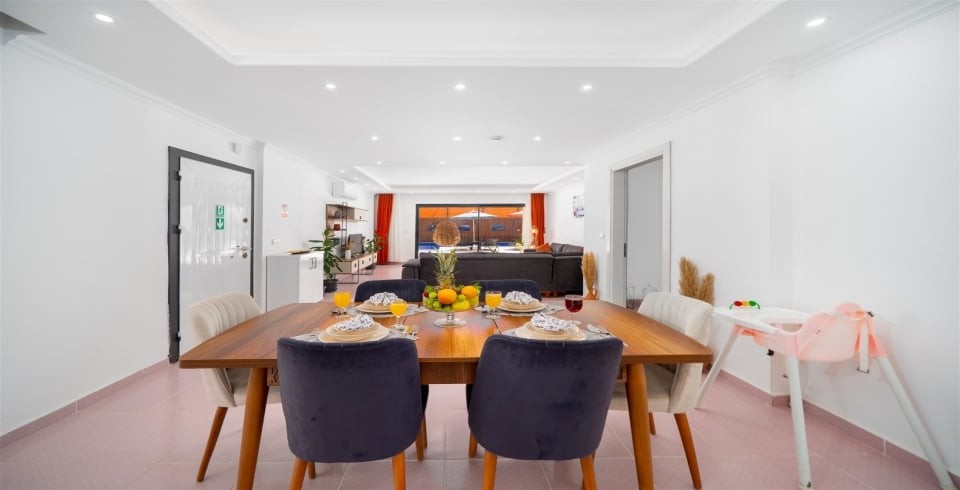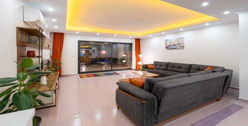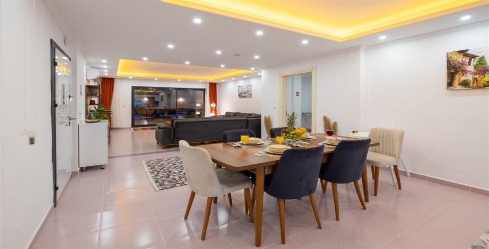 Salon: Villa salonunda konforlu oturma grubu, klima, TV, internet, uydu alıcı, yemek masası, sehpa bulunmaktadır.