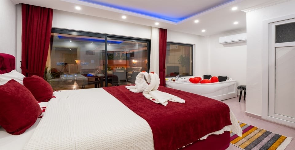 1. Yatak Odası: Çift kişilik yatak, klima, jakuzi, komodin, elbise dolabı, makyaj masası, banyo ve tuvalet bulunmaktadır.