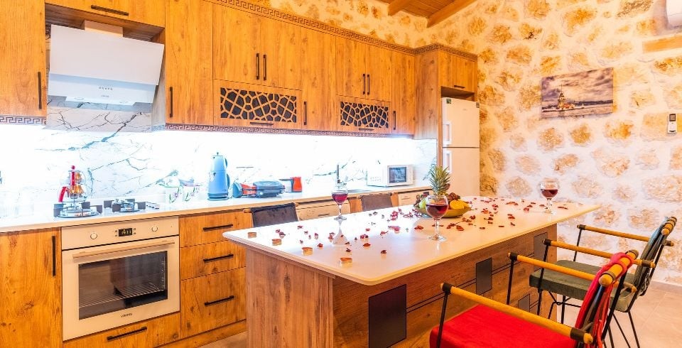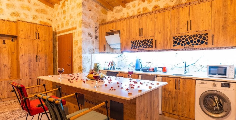 Mutfak: Villamızın mutfağında buzdolabı bulaşık makinası, çamaşır makinası, 4'lü ocak, ketıl, mikro dalga fırın, filtre kahve makinası yemek takımı bulunmaktadır.