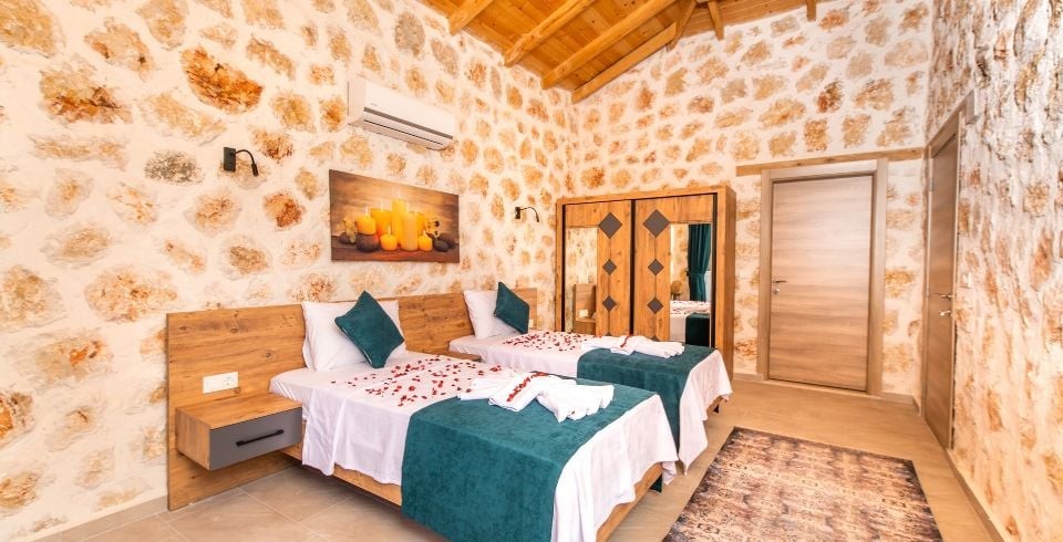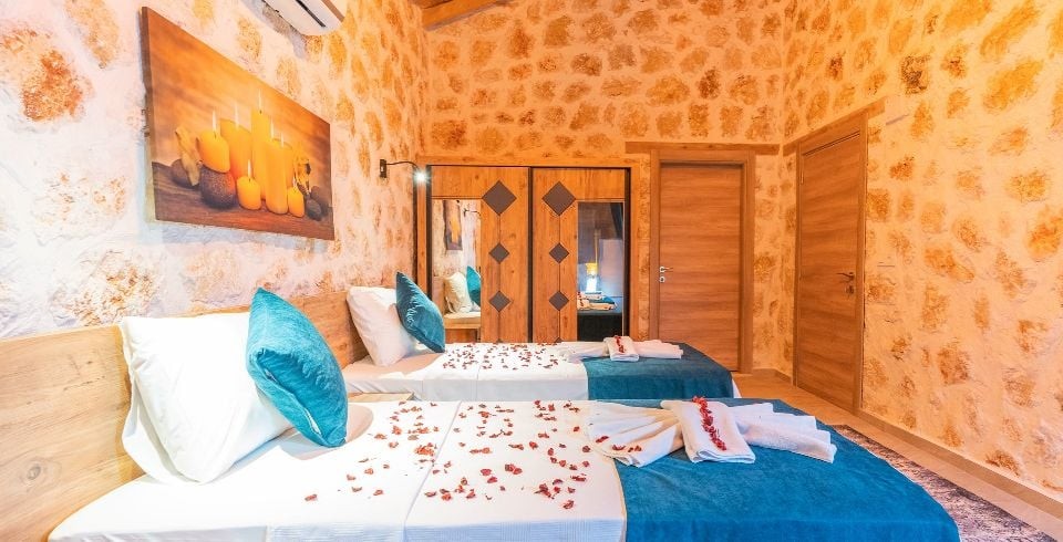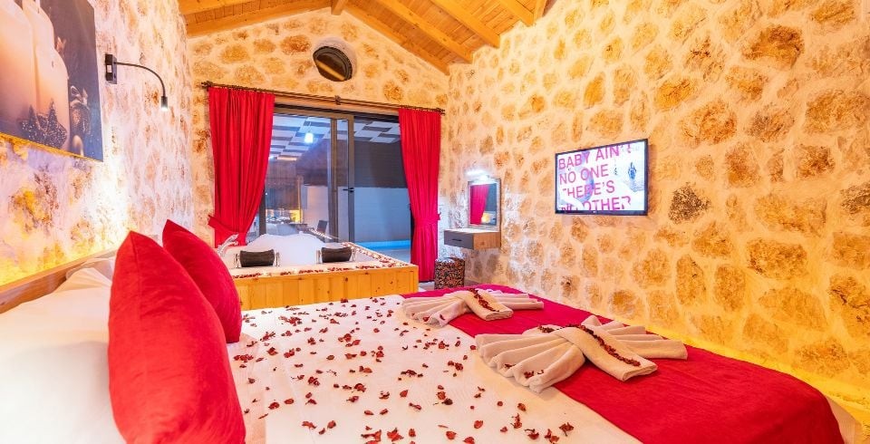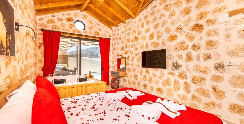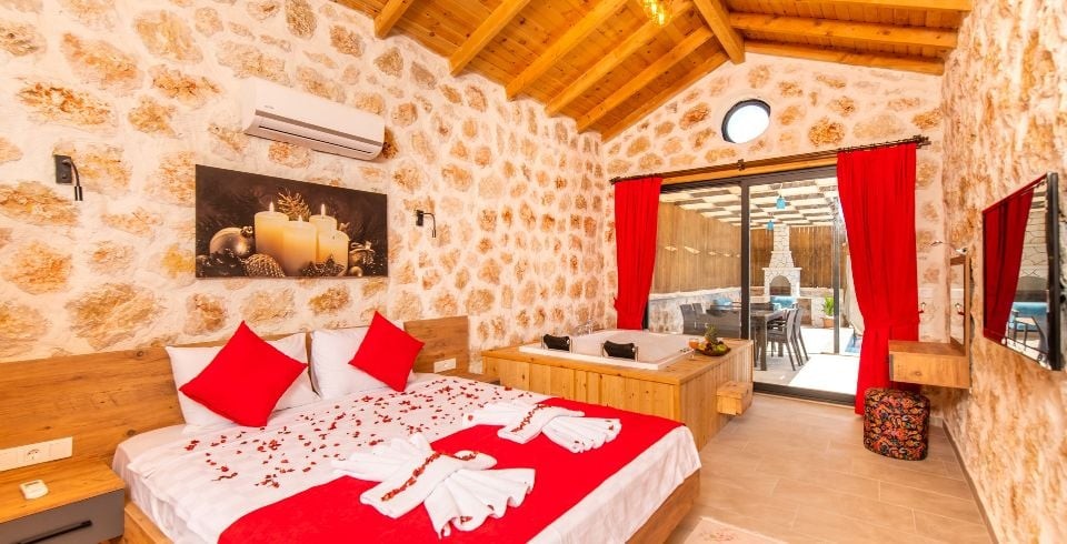 1. Yatak Odası: Çift kişilik yatak, klima, jakuzi, komodin, elbise dolabı, makyaj masası, banyo ve tuvalet bulunmaktadır.