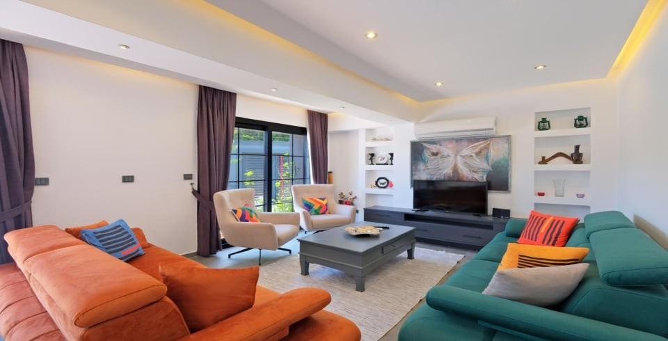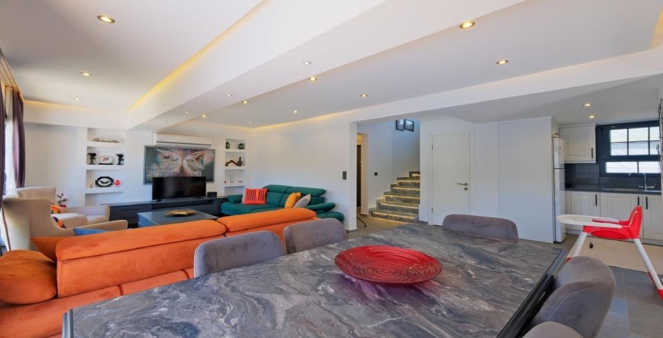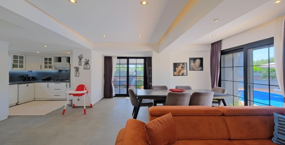 Salon:  Özenle döşenmiş açık mutfaklı salon, modern koltuklar, yemek masası, TV, klima ve havuz terasına çıkış bulunmaktadır.