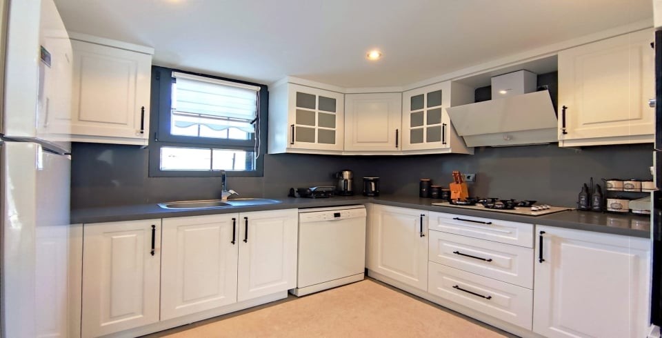 Mutfak: Amerikan mutfak, çamaşır makinası, bulaşık makinası, buzdolabı, ankastre fırın, mikrodalga fırın, ankastre 4'lü ocak, su ısıtıcısı, tencere ve tava takımı, yemek takımı, kaşık çatal bıçak takımı, bardak takımı, yemek masası ve sandalyeler bulunmaktadır.