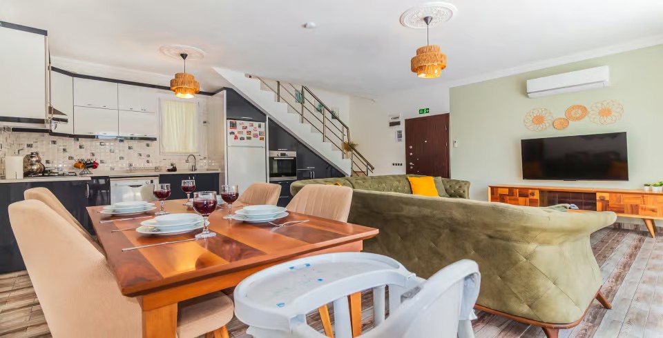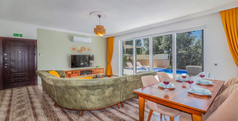 Salon: Villa salonunda konforlu oturma grubu, klima, TV, internet, uydu alıcı, yemek masası, sehpa bulunmaktadır.