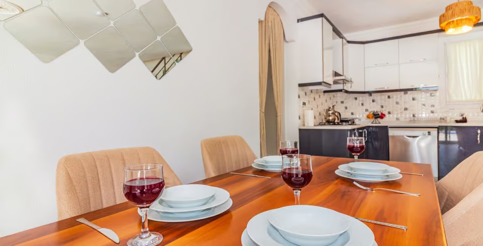 Mutfak: Villamızın mutfağında buzdolabı bulaşık makinası, çamaşır makinası, 4'lü ocak, mikro dalga fırın, filtre kahve makinası 4 kişilik yemek takımı bulunmaktadır.