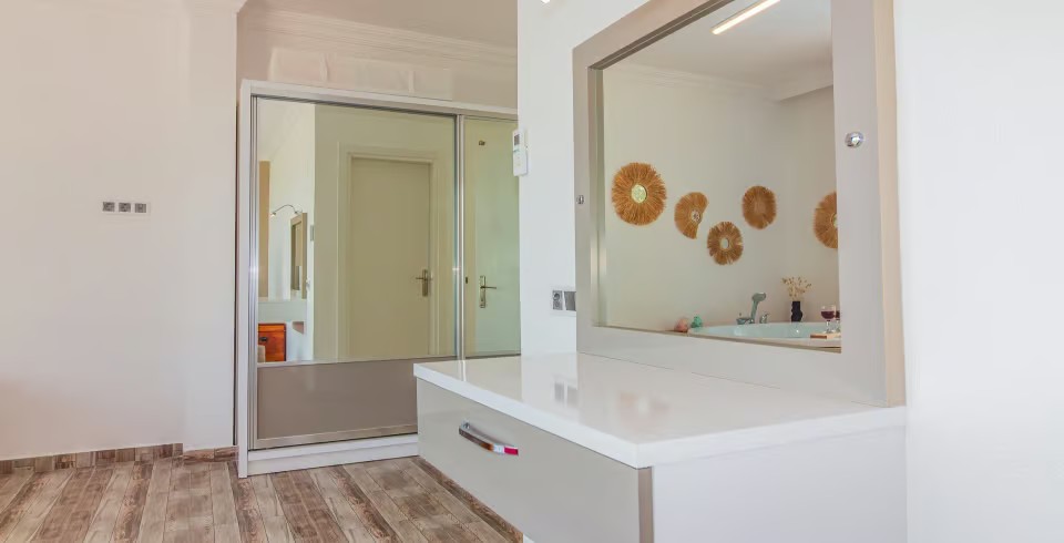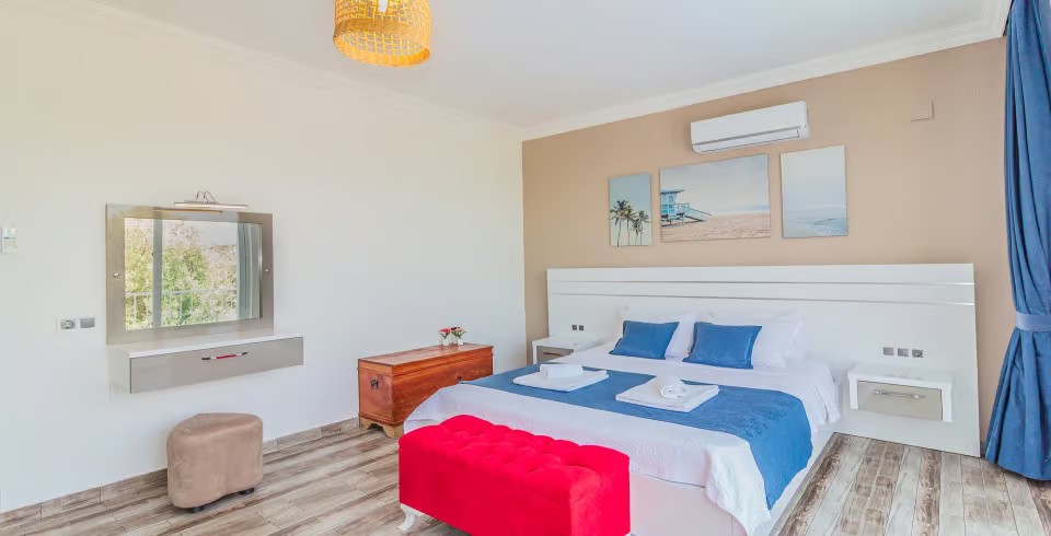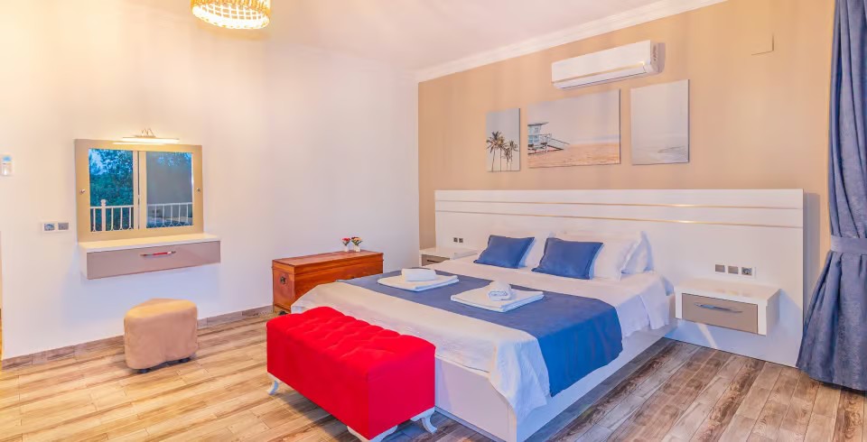 1. Yatak Odası: Çift kişilik yatak, klima, jakuzi, TV, komodin, elbise dolabı, makyaj masası, banyo ve tuvalet bulunmaktadır.