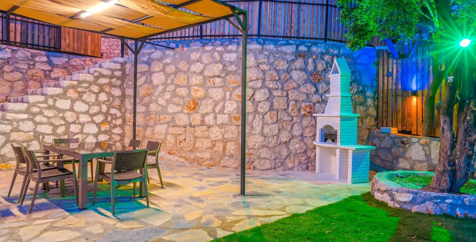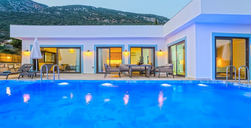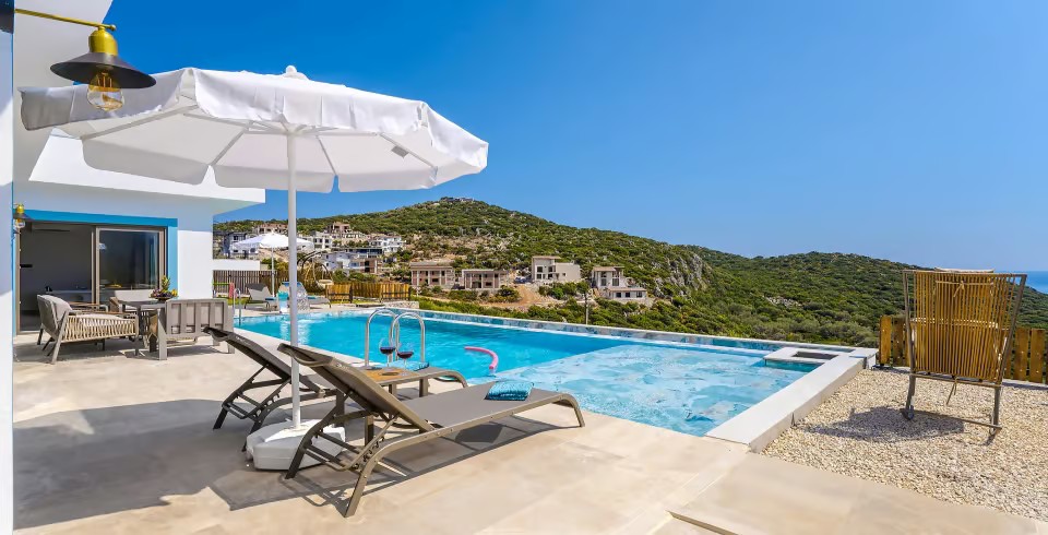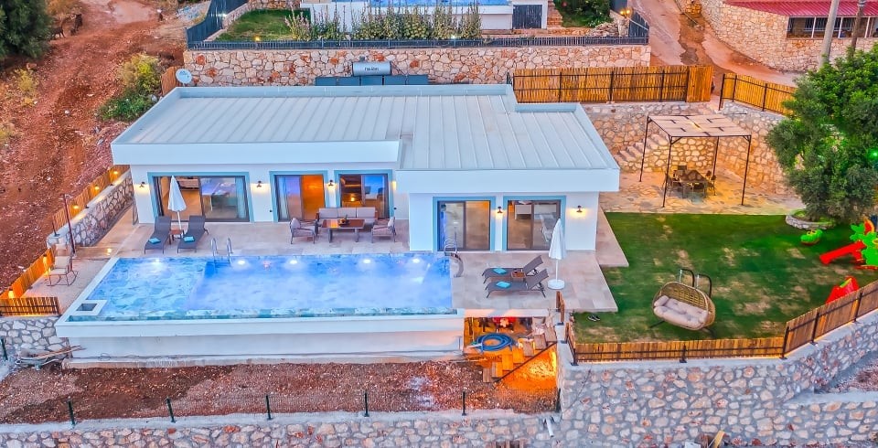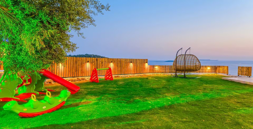 Havuz ve Bahçe: Villamızın Havuz terasında özel yüzme havuzu, şezlonglar, güneş şemsiyesi, masa ve sandalyeler, salıncak, çocuk oyun parkı, barbekü bulunmaktadır.